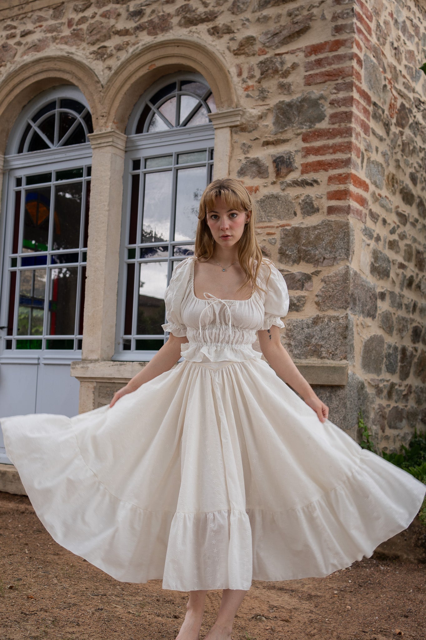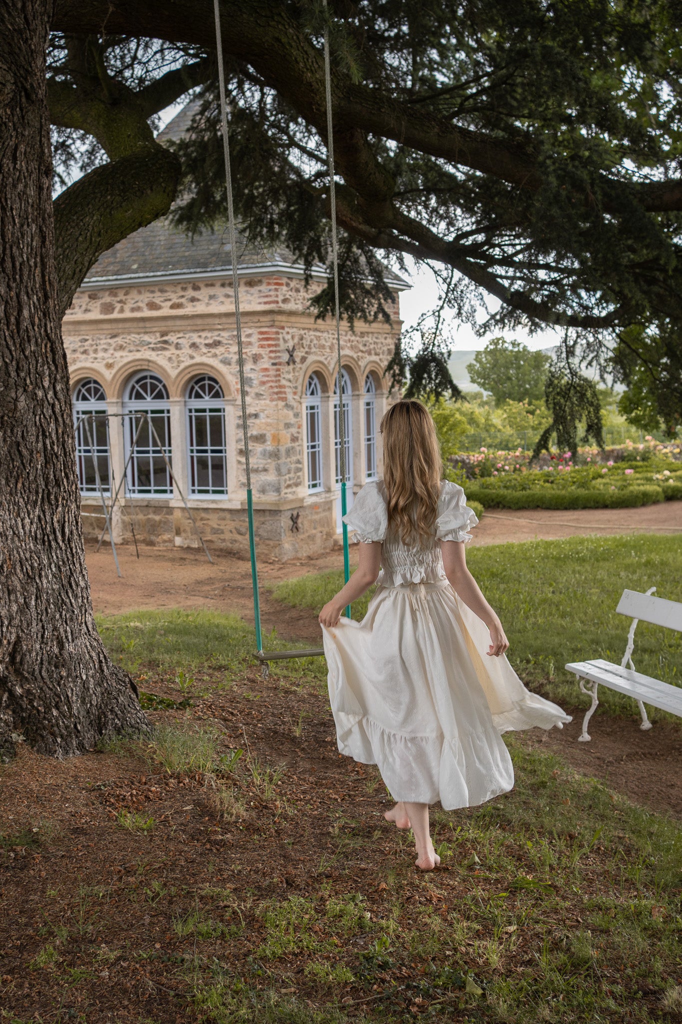 The skirt is inspired by dresses worn in many historical eras, with our staple V-shaped waistline. It features a big ruffled full circle skirt, to make all your twirls perfect. The ruffled hem is the icing on the top, and makes the skirt heavy and beautiful.