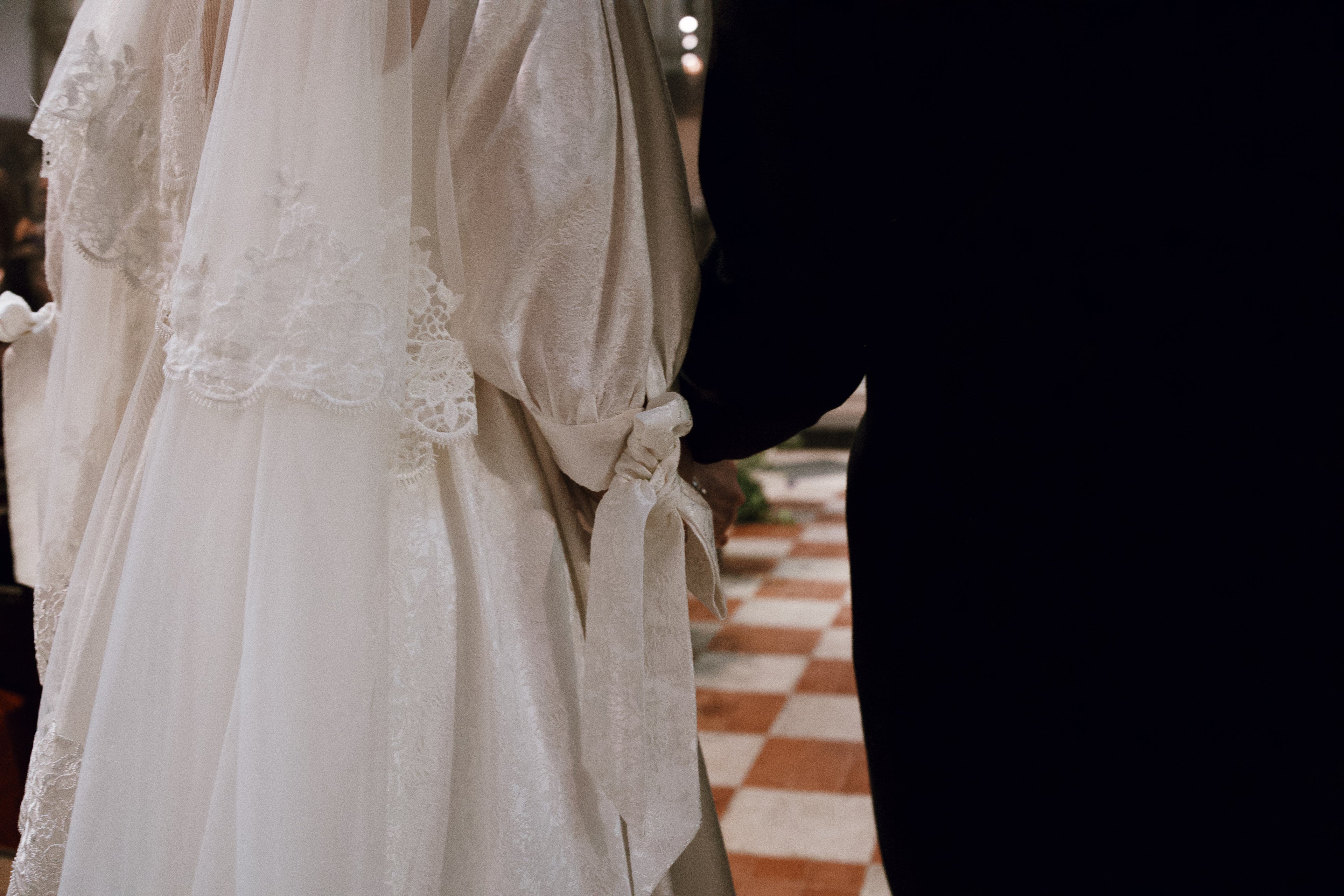The buttons are handmade, covered in the same fabric as the gown. Invisible zipper from YKK.