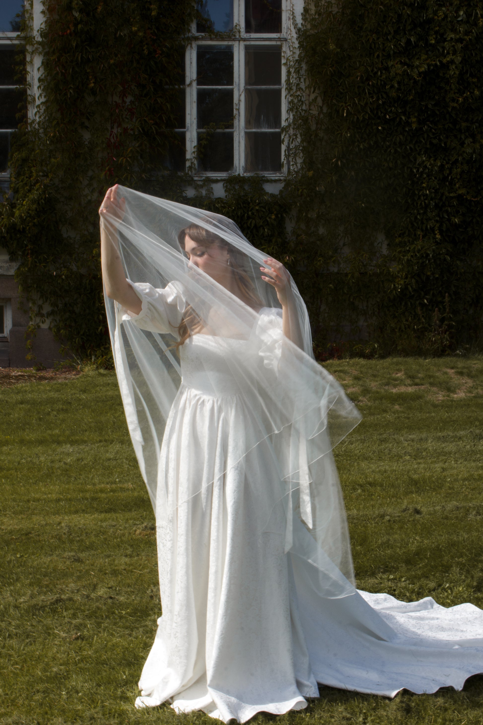 The bodice of the dress is lined in a cotton fabric, and the skirt is unlined as to not show any extra unfortunate fabric when walking, running and showing off the split. No underskirt is worn in any of the photos. If you want the gown to be more poofy, we are able to make the skirt without the split, so you can add any underskirt you like. Under white gowns it is recommended to wear only nude underwear to not augment the colour of the gown.