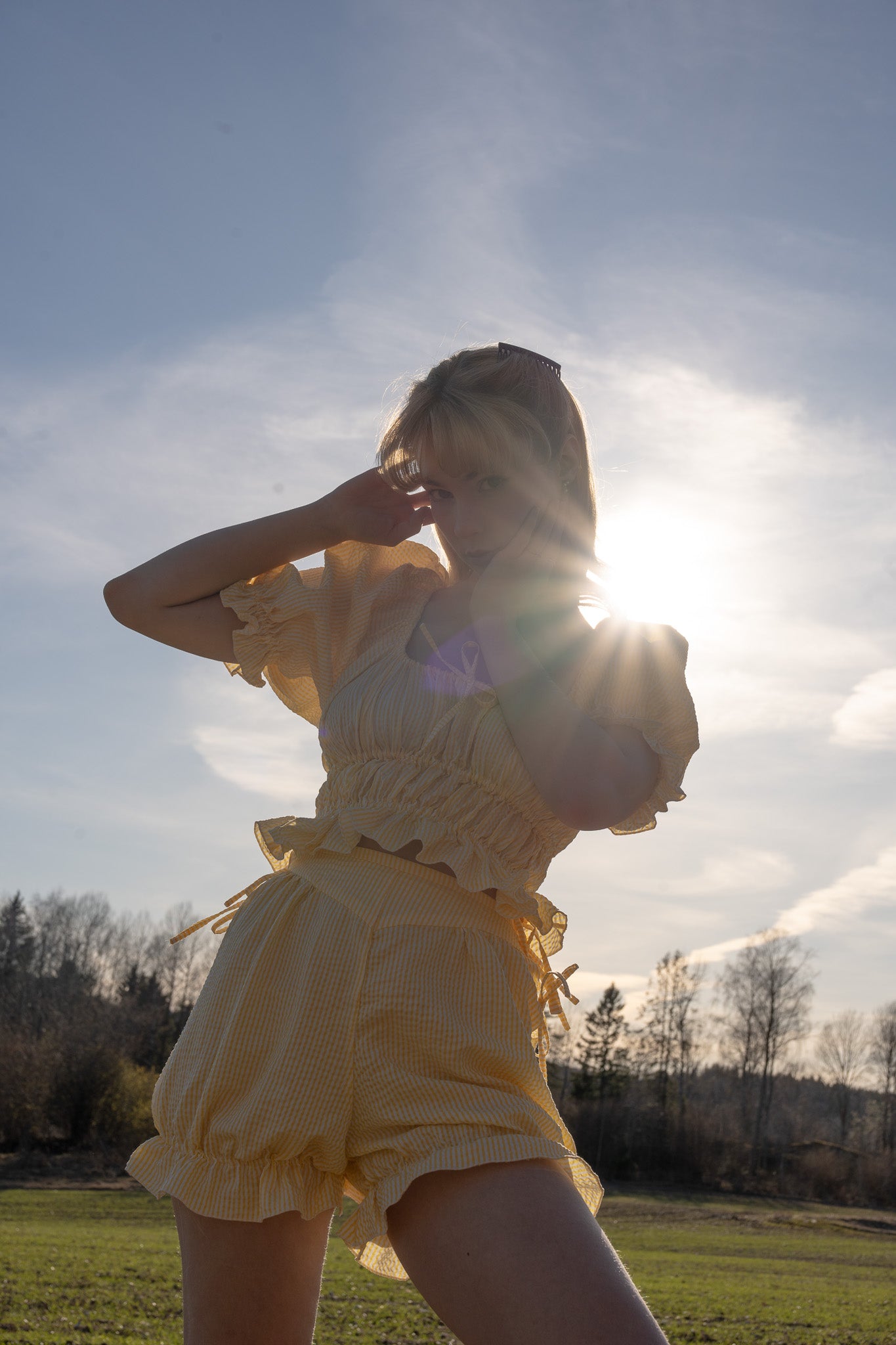 A limited edition Darcy set, made in a beautiful yellow cotton fabric bought in Paris. This set features a never before seen Darcy top and our Darcy Bloomers to match, which is usually only available to buy as a sewing pattern.